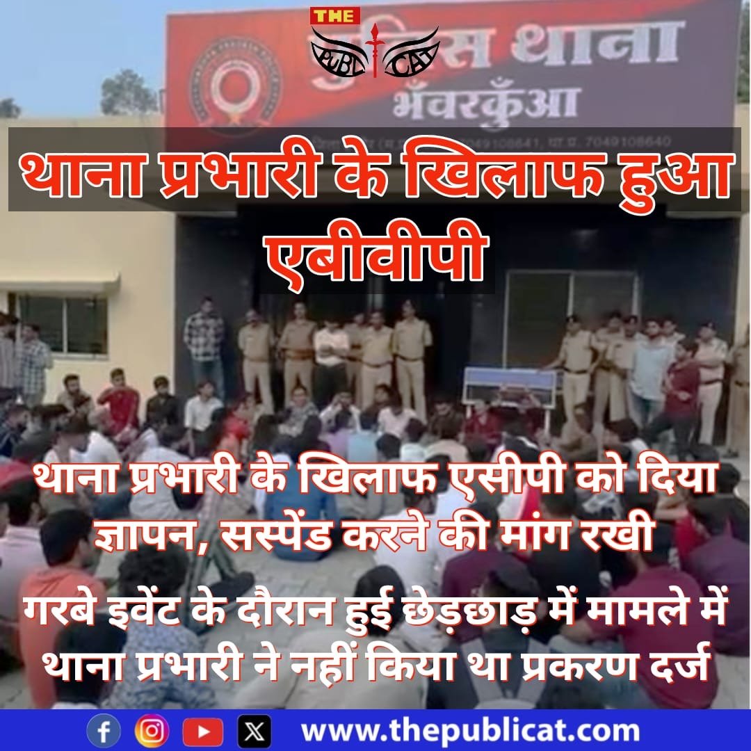 असल में, देवी अहिल्या विश्वविधालय के आईईटी कैंपस में गुरुवार को रास गरबा इवेंट के दौरान कॉलेज के छात्रों का एबीवीपी के कार्यकर्ताओं से विवाद हो गया था। एबीवीपी के सार्थक जैन ने बताया मामले में एबीवीपी के कार्यकर्ता हॉस्टल के छात्रों की रिपोर्ट करने भंवरकुआं थाने पहुंचे और मामला बताया तो थाना प्रभारी राजकुमार यादव ने उनकी नहीं सुनी और सिर्फ मारपीट की धाराओं में प्रकरण दर्ज कर लिया। जबकि कार्यकर्ताओं का कहना था कि विवाद के दौरान आरोपियों ने छात्राओं के साथ बदसलूकी की है। छेड़छाड़ हुई है जिसके कारण विवाद हुआ। बावजूद थाना प्रभारी नहीं माने। हमे डरा कर मामूली धाराओं में प्रकरण दर्ज कर लिया। इसी के चलते हमनें थाना घेराव कर विवाद के मामले में छेड़छाड़ का प्रकरण दर्ज होने की माँग रखी और टीआई को सस्पेंड करने के लिए एसीपी को ज्ञापन दिया। सार्थक ने यह भी जानकारी में बताया थाना प्रभारी राजकुमार यादव नशे के कारोबार को संरक्षण दे रहे है जिसके चलते कॉलेज कैंपस में नशा बढ़ रहा है। कुछ समय पहले जब श्री अटल बिहारी कॉलेज में एबीवीपी ने प्रदर्शन किया था, उस समय भी थाना प्रभारी ने धक्का मुक्की के दौरान छात्राओं के साथ बदसलूकी की थी।