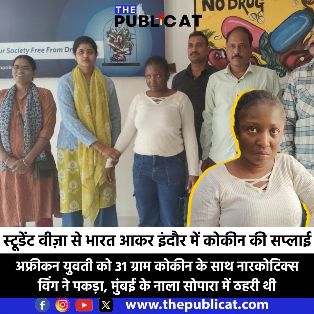 द पब्लिकेट, इंदौर। रेसीडेंसी क्षेत्र से नारकोटिक्स विंग की टीम ने मंगलवार को अफ्रीकन युवती को करीब 15 लाख की कोकीन के साथ पकड़ा है। युवती मूल रूल से अफ्रीका की रहने वाली है लेकिन पिछले कुछ सालों से मुंबई के नाला सोपारा में रहती है। विंग मामले में युवती से पूछताछ कर पता लगा रही है कि कोकिन कहां से आई और किसने मंगवाई है।