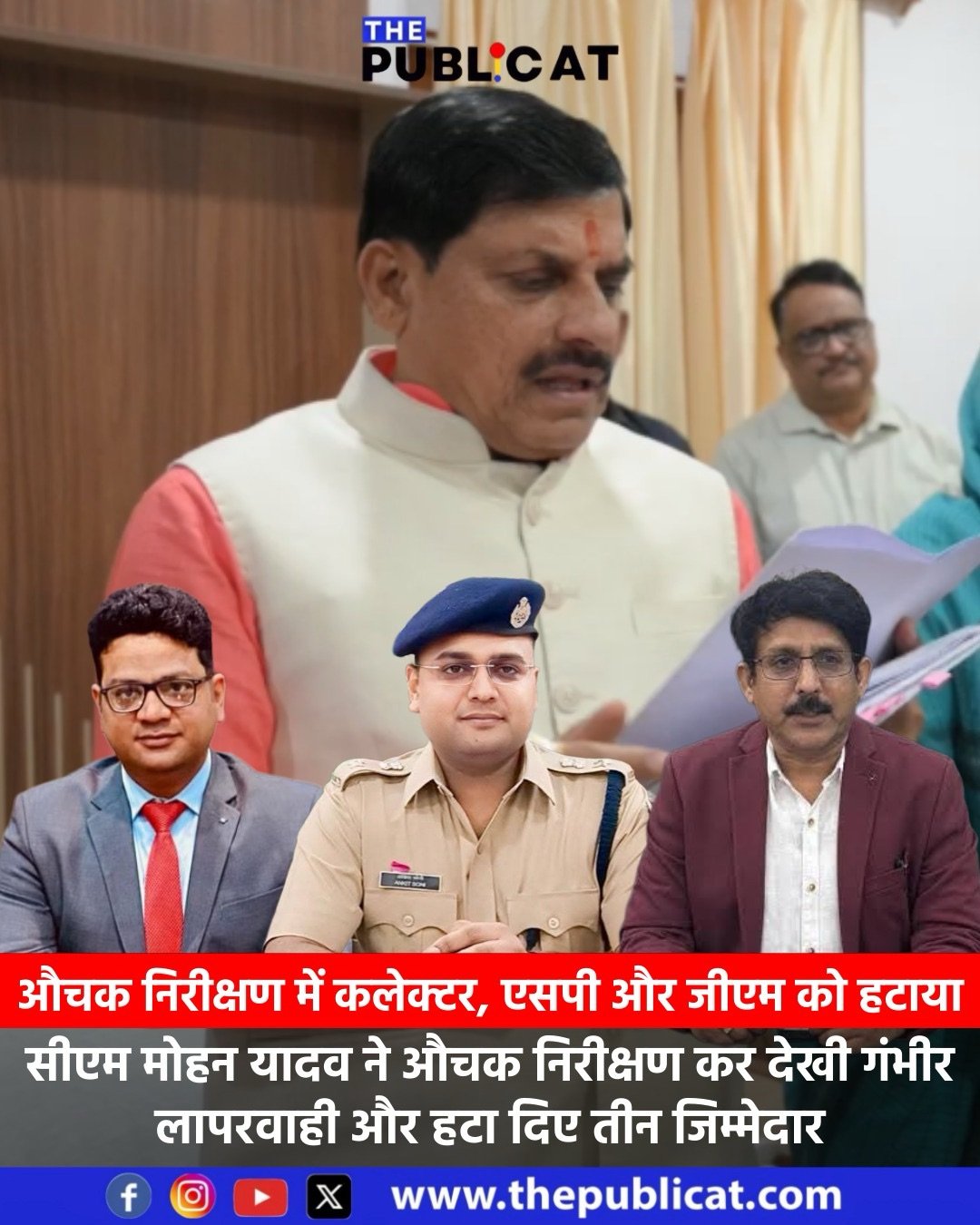 द पब्लिकेट, भोपाल। मध्य प्रदेश के मुख्यमंत्री मोहन यादव ने अपनी चेतावनी को हकीकत में बदलते हुए प्रदेश में प्रशासनिक लापरवाही पर बड़ी कार्रवाई की है। पहले ही स्पष्ट कर चुके थे कि कभी भी औचक दौरा हो सकता है। अब उसी के तहत सख्त कदम उठाए गए हैं।