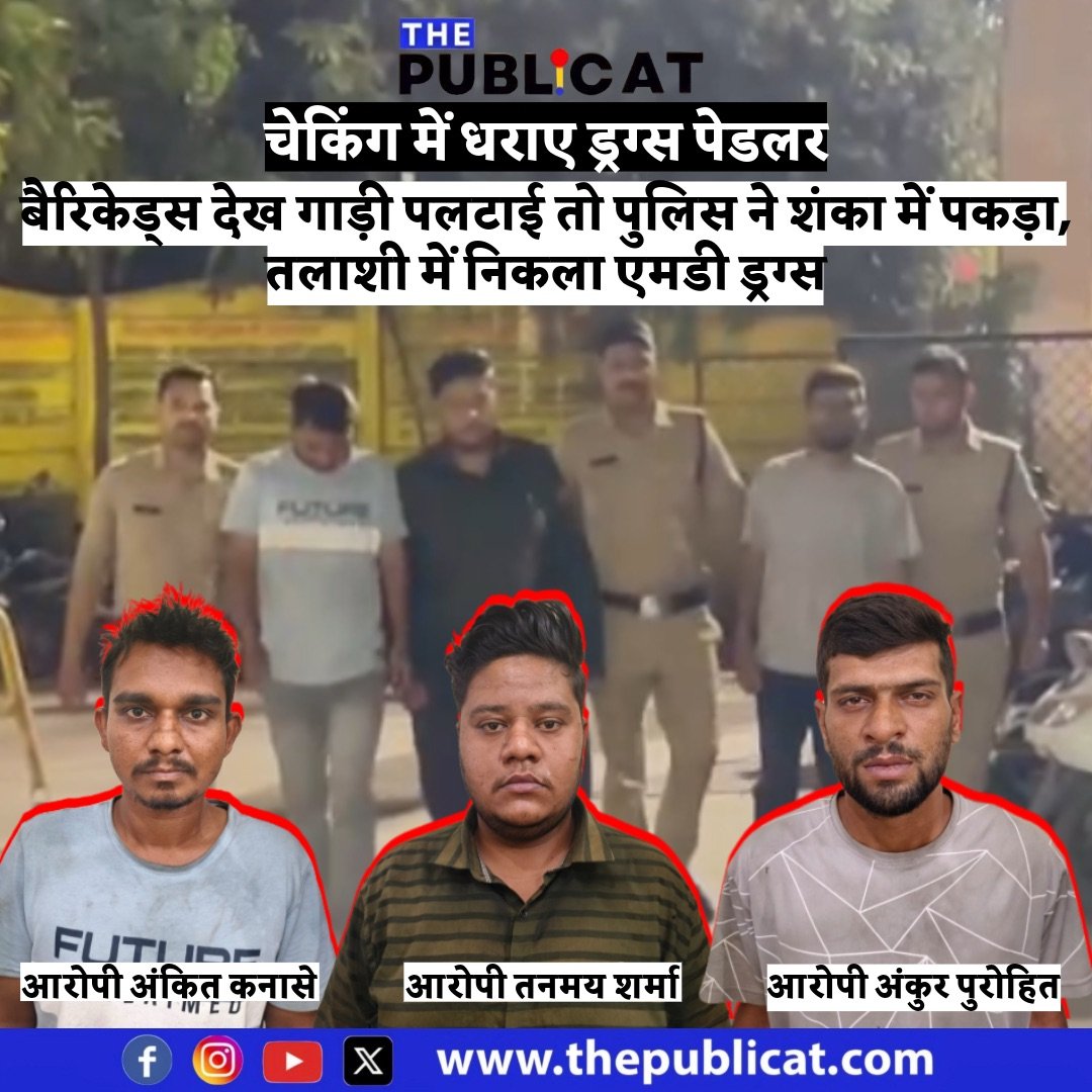 विजय नगर पुलिस ने बताया शनिवार की रात चौराहे पर चेकिंग के दौरान एक स्कूटी पर तीन युवक सवार होकर चेकिंग की ओर आ रहे थे। तभी वह चेकिंग की बैरिकेड्स देख भागने के लिए गाड़ी पलटने लगे। पुलिस को शंका हुई तो उन्होंने तीनों को पकड़ा और पूछताछ की। इसके बाद तलाशी लेने पर आरोपी अंकित पिता मोतीलाल कनासे निवासी ग्राम बरखेड़ा खरगोन के पास से 16.2 ग्राम एमडी ड्रग्स, तनमय पिता योगेश शर्मा निवासी अहिल्यापुरी रेडियो कॉलोनी आजाद नगर के पास से 11.4 ग्राम एमडी ड्रग्स और अंकुर पिता गोपाल पुरोहित निवासी अहिल्यापुरी रेडियो कॉलोनी आजाद नगर के पास से 10.4 ग्राम एमडी ड्रग्स बरामद हुआ। पुलिस ने तीनों को गिरफ्तार कर एनडीपीएस का केस दर्ज किया है। तीनों आरोपियों से पूछताछ के लिए कोर्ट में पेश कर रिमांड मांगा है। द पब्लिकेट को जानकारी लगी है कि आरोपी तनमय शर्मा का ब्याज बट्टे का भी काम है।
