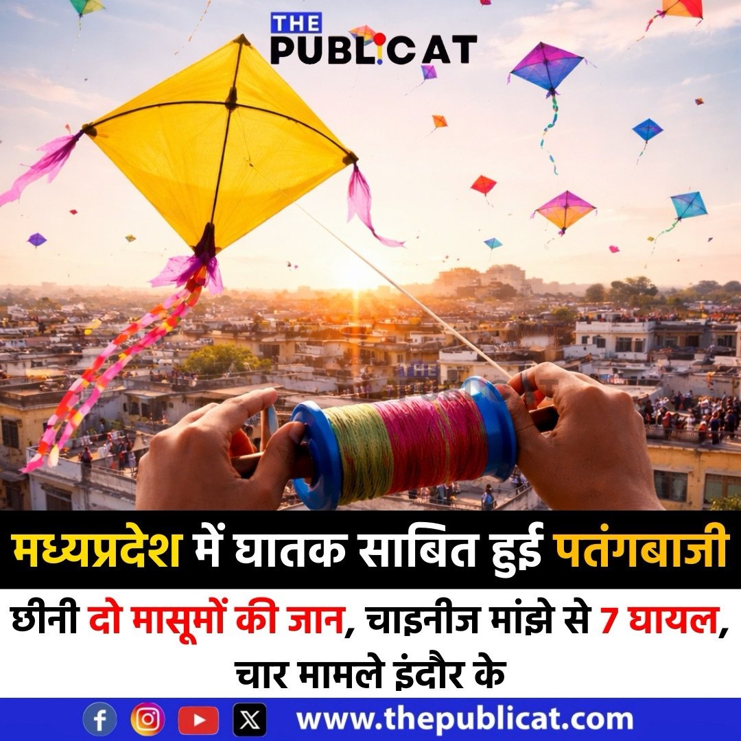 द पब्लिकेट, मध्य प्रदेश। मकर संक्रांति का पर्व मध्य प्रदेश में दो परिवारों के लिए मातम में बदल गया। प्रतिबंधित चाइनीज मांझे और लापरवाही भरी पतंगबाजी के चलते प्रदेश के अलग-अलग इलाकों में हुए हादसों में दो बच्चों की मौत हो गई, जबकि इंदौर, उज्जैन और इटारसी में सात लोग गंभीर रूप से घायल हो गए। हादसों की यह श्रृंखला एक बार फिर प्रशासन की सख्ती और जन-जागरूकता पर सवाल खड़े करती है।