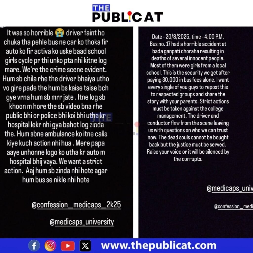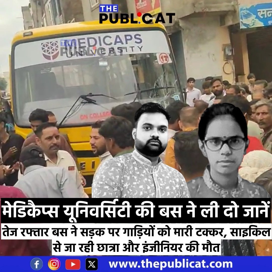 द पब्लिकेट, इंदौर। मेडिकैप्स यूनिवर्सिटी की तेज रफ्तार बस से दो लोगों की जान ले ली, कई लोगों को घायल किया और वाहनों को नुकसान पहुंचाया। इसमें मेडिकैप्स कॉलेज प्रबंधक की बड़ी लापरवाही सामने आई। घटना के बाद कॉलेज के छात्रों ने सोशल मीडिया पर अपनी आपबीतियां बताई। हादसे के बाद मल्हारगंज पुलिस ने आरोपी बस ड्राइवर जीवनसिंह ठाकुर को देर रात गिरफ्तार कर लिया है।