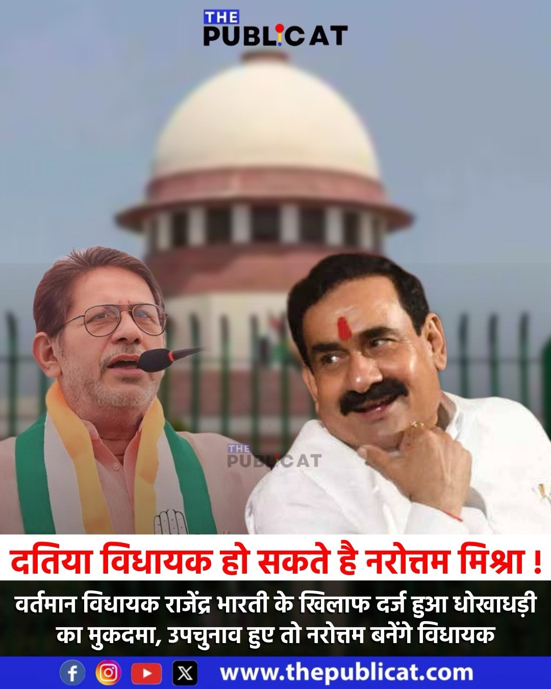 आपको बता दें, राजेंदता भारती ने पिछले चुनाव में कत्तावर नेता नरोत्तम मिश्रा को आठ हज़ार आठ सो वोटों से चुनाव हराया था जिसके बाद मिश्रा लगातार महामाई की सेवा में लगकर अपनी विधायकी की कामना कर रहे थे। इसी बीच राजेंद्र भारती पर मामला दर्ज हो गया और कोर्ट ने उन्हें सजा सुना दी। हालांकि कोर्ट ने साठ दिन का समय दिया जिसमें राजेंद्र भर्ती अपने बचाव के लिए कोर्ट में आवेदन प्रस्तुत करना होगा। लेकिन बात की जाए दतिया की विधायकी की तो कुर्सी खाली होने पर उपचुनाव होना निश्चित है। अगर उपचुनाव हुए तो दतिया से नरोत्तम मिश्रा को वापस से दतिया के विधायक की कुर्सी मिल सकती है। सूत्रों बताते है कि कुछ ही दिनों में उपचुनाव होयेंगे और विधायक नरोत्तम मिश्रा को बनाया जाएगा।