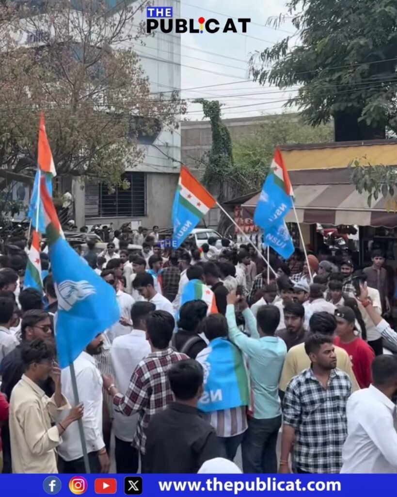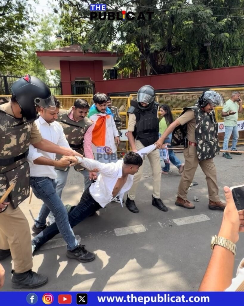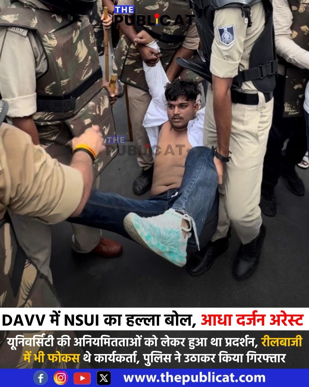 द पब्लिकेट, इंदौर। देवी अहिल्या विश्वविद्यालय की अनियमितियों को लेकर एनएसयूआई छात्र संगठन ने अपने कार्यकर्ताओं के साथ आरएनटी मार्ग स्थित डीएवीवी परिसर में जमकर नारेबाजी करते हुए प्रदर्शन किया। करीब डेढ़ से दो घंटे चले इस प्रदर्शन में कई छात्र नेता अपनी सोशल मीडिया की राजनीति चमकाने के लिए रीलबाजी के चक्कर में जबरन बेरिकेड्स पर चढ़कर विरोध करने लगे। इससे प्रदर्शन ने उग्र रूप ले लिया। पुलिस की समझाइश पर भी प्रदर्शनकारी नहीं माने तो पुलिस ने जिला अध्यक्ष सहित छह पदाधिकारियों को गिरफ्तार किया।