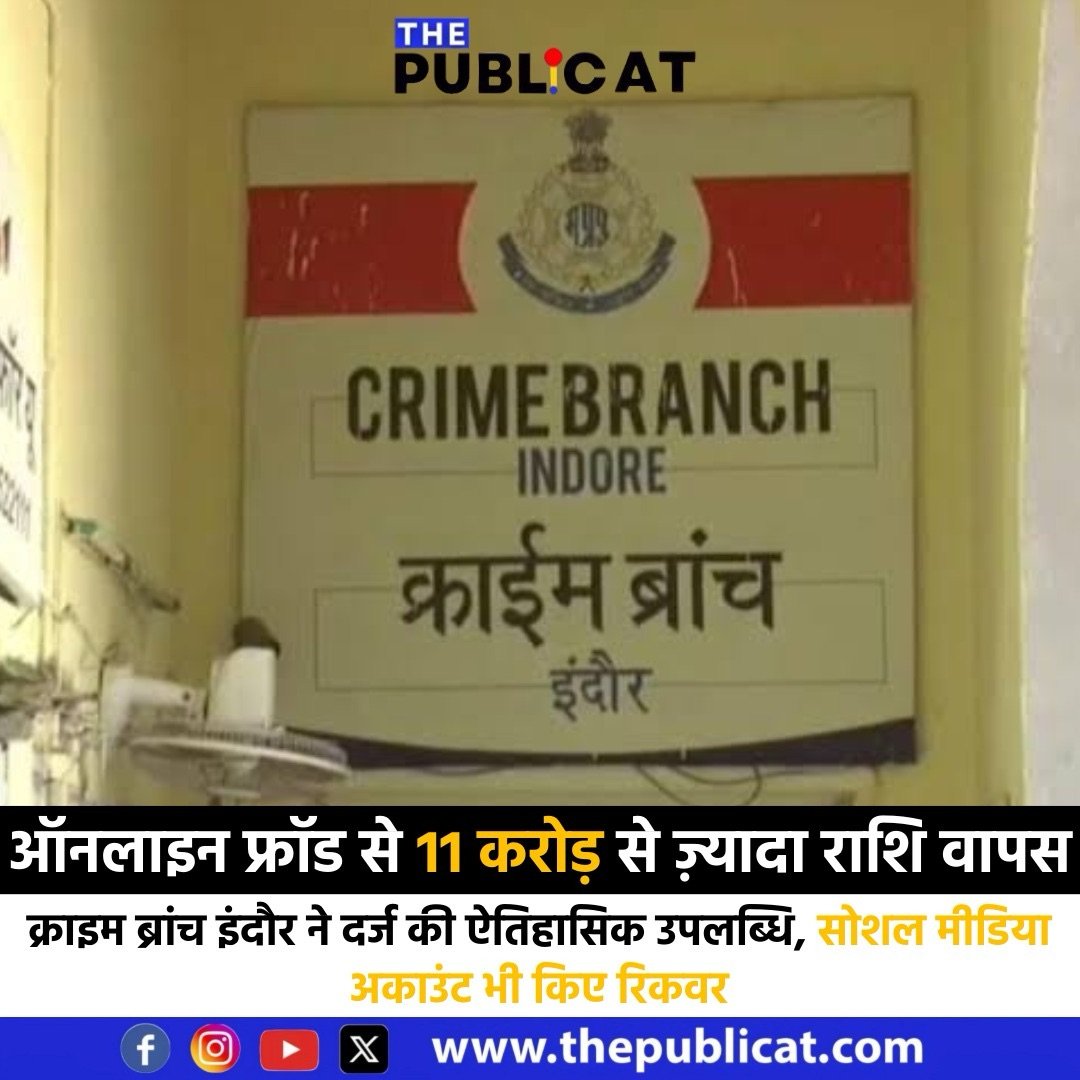 द पब्लिकेट, इंदौर। साइबर ठगी के मामलों में लगातार बढ़ती शिकायतों के बीच इंदौर क्राइम ब्रांच ने वर्ष 2025 में बड़ी सफलता हासिल की है। क्राइम ब्रांच की फ्रॉड इन्वेस्टिगेशन टीमों ने अब तक ऑनलाइन फ्रॉड से पीड़ित नागरिकों को ₹11 करोड़ 30 लाख 23 हजार 919 रुपए से अधिक की राशिसकुशल वापस कराई है।