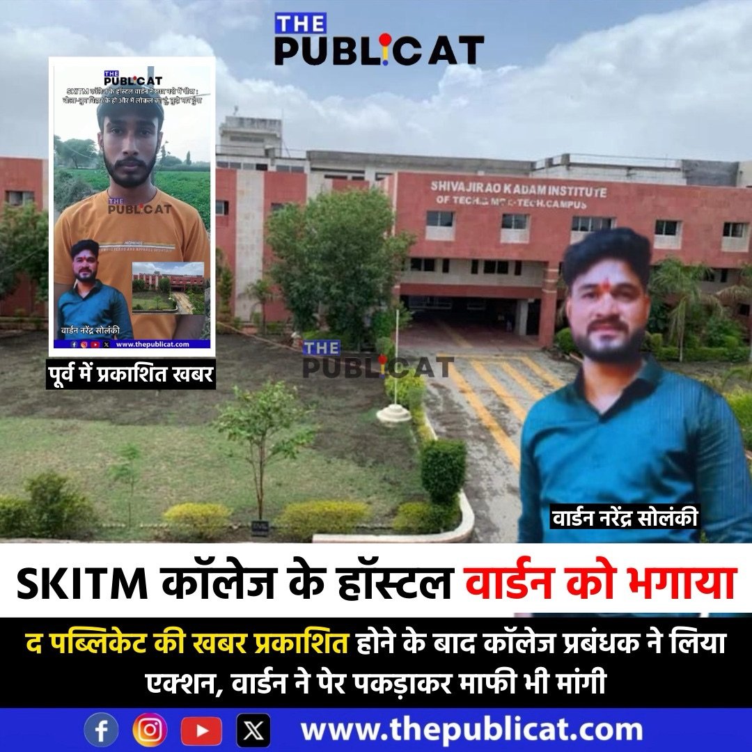 द पब्लिकेट, इंदौर। शिवाजीराव कदम इंस्टिट्यूट ऑफ़ टेक्नोलोनी एंड मेजमेंट में शुक्रवार रात हॉस्टल के वार्डन नरेंद्र सोलंकी ने बिहार से इंदौर आकर पढ़ाई करने वाले छात्र के साथ साथ जमकर मारपीट की थी। मामले में द पब्लिकेट ने प्रमुखता से खबर प्रकाशित की थी जिसपर कॉलेज प्रबंधक ने एक्शन लेते हुए अगले दिन ही वार्डन को कॉलेज के हॉस्टल से बाहर फेंका। वहीं, वार्डन ने गिड़गिड़ाते हुए छात्र से माफी भी मांगी।