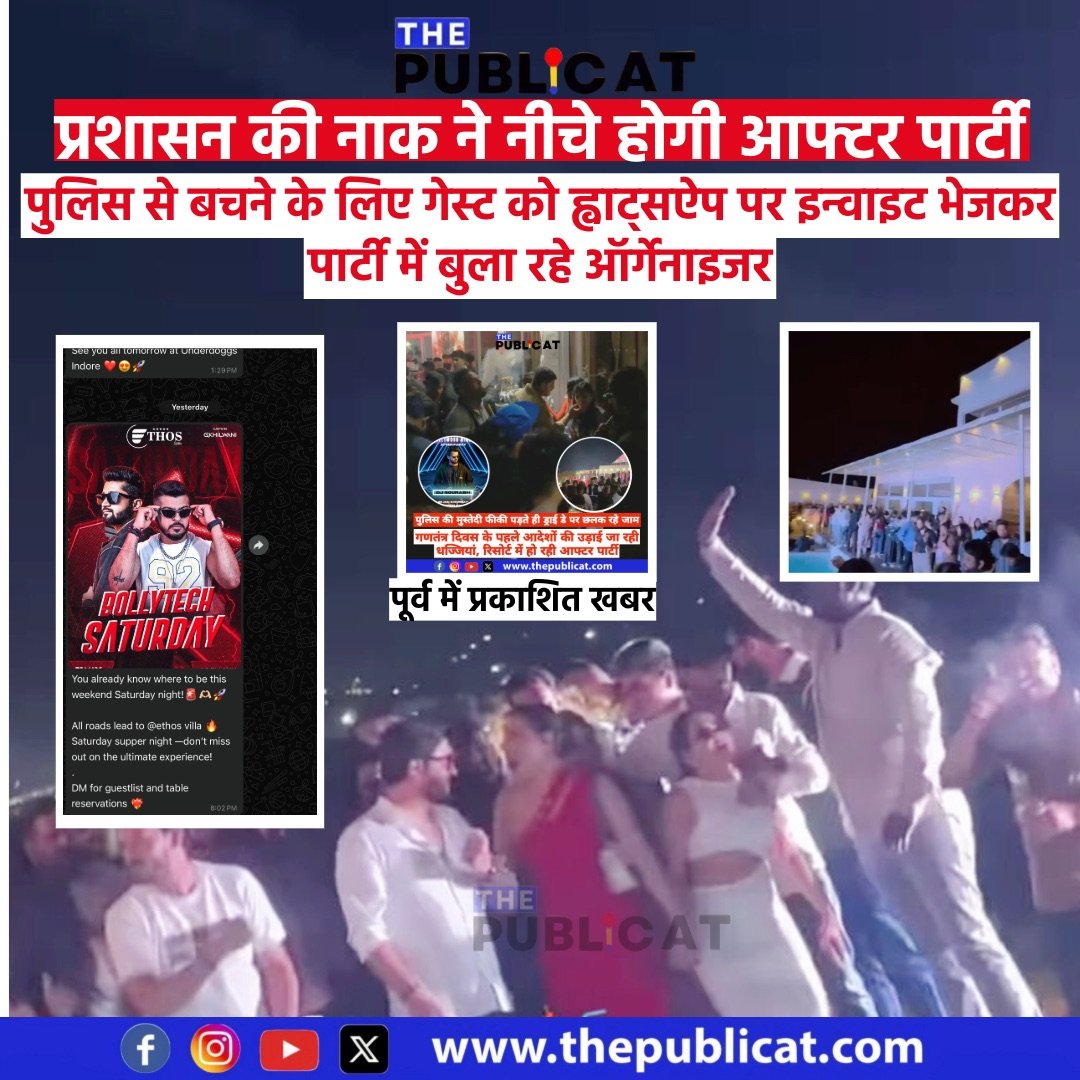 द पब्लिकेट, इंदौर। शहर में शराब पार्टियों का समय निर्धारित होने के बाद भी पार्टी ऑर्गेनाइजर मोटी रकम कमाने के लिए शहर की सीमाओं पर बने फार्महाउस पर देर रात तक पार्टियां करवा रहे है। पुलिस से बचने के लिए ह्वाट्सऐप पर गेस्ट को बुलाने के किए इनविटेशन भेज रहे है। द पब्लिकेट को सूत्रों से जानकारी लगी है कि अरबिंदो के पास रेवती रेंज के समीप बने ईथोस फार्महाउस में आफ्टर पार्टी होने वाली है। पार्टी का इनविटेशन हाथ लगा है। गोपाल नाम का ऑर्गेनाइजर ईथोस फार्महाउस में आज रात जमकर शराबखोरी करवाएगा। आपको बता दें, शहर में कुछ दिन पहले ही ईथोस क्लब में आफ्टर पार्टी का वीडियो वायरल हुआ था जिसमें हुक्के भी था। संभ्रांत परिवार के युवाओं ने जमकर शराबखोरी भी की थी। इसके बाद कनाडिया इलाके के केव क्लब में भी आफ्टर पार्टी का वीडियो वायरल हुआ था। दोनों पार्टियां गोपाल नाम के युवक ने करवाई थी। वहीं, पार्टी में अवैध शराब बुलाकर परोसी जाएगी। अब देखना यह है कि आज होने वाली आफ्टर पार्टी में प्रशासन क्या कार्रवाई करती है।