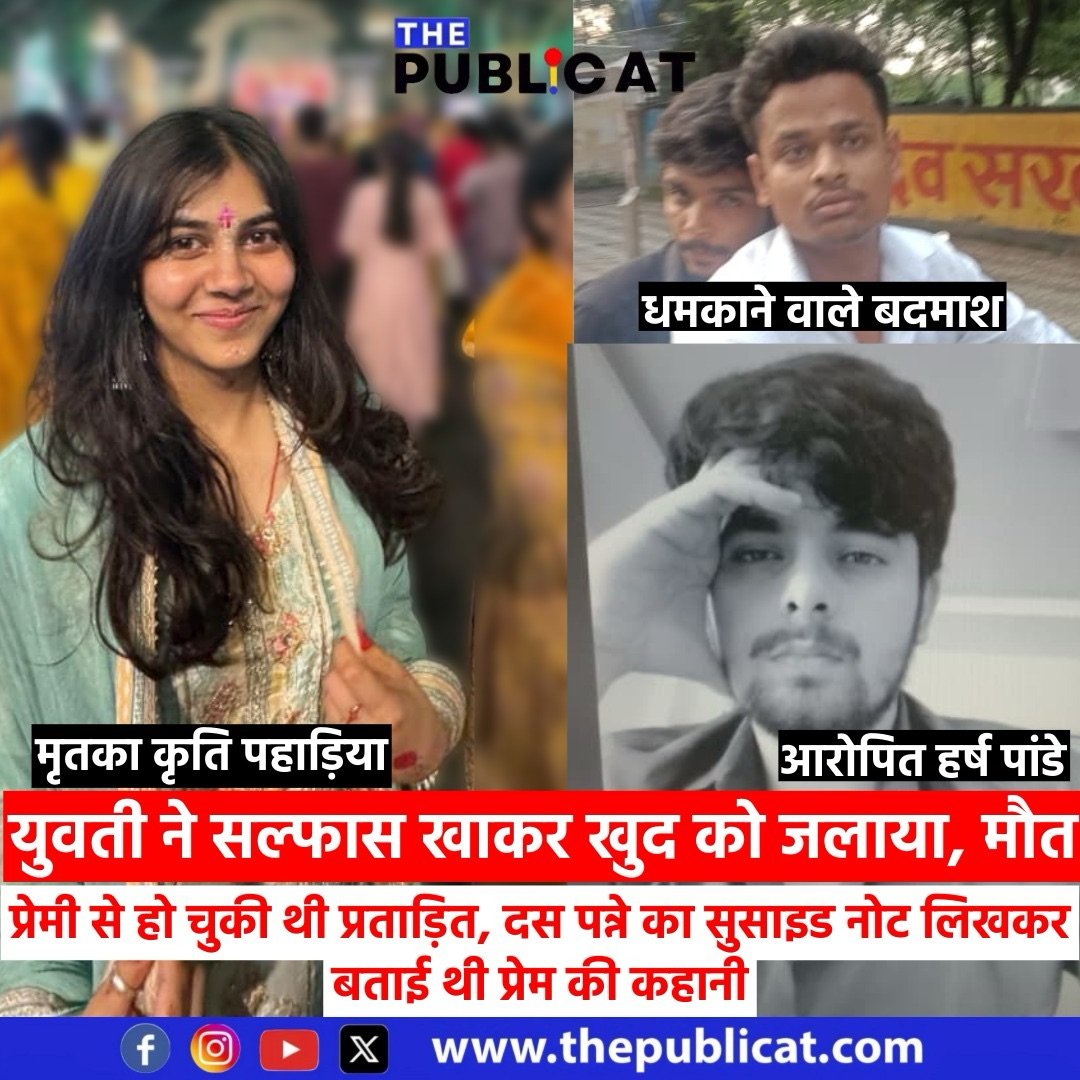 परिजन के मुताबिक अस्पताल के बाहर बाइक ( MP 09 DZ 5352) से दो युवक हमें घूर रहे थे। दोनों से बात की तो धमकाने लगे। उनका कहना था कि कृति ने जिसके कारण आहत्या की है उसका नाम बाहर नहीं आना चाहिए नहीं तो अच्छा नहीं होगा। हमारा कुछ नहीं बिगाड़ सकते। हमारी बड़ी बातचीत है। इसके बाद बदमाशों ने अपना आधार कार्ड भी उनको दिया और धमकाकर भाग निकले। पुलिस ने शिकायत पर आकाश पांडे और अन्य को हिरासत में लिया है।