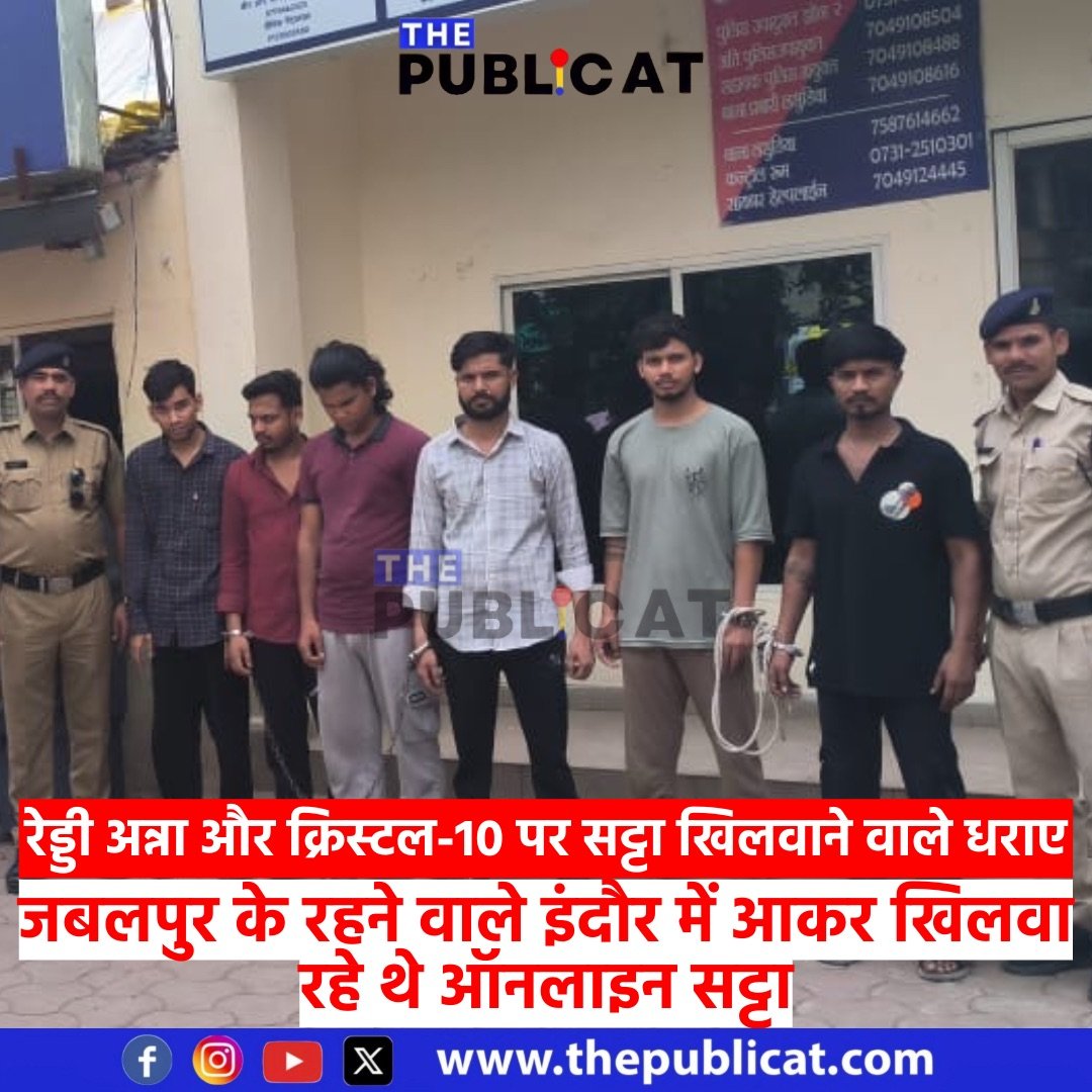 लसूड़िया पुलिस में बताया सूचना मिली थी कि बॉम्बे हॉस्पिटल के पास रिजेंसी बिल्डिंग में सट्टा संचालित हो रहा है। इसपर कल एसीपी आदित्य पटले ने लसूड़िया और विजय नगर की टीम को तैयार कर कार्रवाई करने के लिए भेजा। टीम रिजेंसी बिल्डिंग के फ्लैट नंबर 201 में पहुंची तो देखा की फ्लैट में आरोपी राहुल पिता दिनेश कुमार रजक 25 निवासी जबलपुर, अर्पित पिता स्व. वैरिन्द्र कुमार केशरवानी 24 जबलपुर, शुभम पिता नीलकमल जैसवाल 24 निवासी जबलपुर, अनिकेत पिता राजेश कुमार पटेल 25 निवासी जबलपुर, अजय पिता मुन्नालाल जैसवाल 22 निवासी मऊगंज और अमित पिता लालजी भौतम 20 निवासी जबलपुर रेड्डी अन्ना और क्रिस्टल-10 के माध्यम से ऑनलाइन सट्टा संचालित कर रहे थे। आरोपियों ने लोगों से अलग-अलग खतों में रुपए भी डलवाए है। पुलिस ने आरोपियों को गिरफ्तार कर लिया है। इनके फ्लैट से 51 समिकार्ड, 35 मोबाईल, 6 टैबलेट, 7 ए.टी.एम./ डेबिट कार्ड, 3 पासबुक और 13 हजार रुपए भी जप्त हुए है। बताया जा रहा है राहुल इसका मास्टरमाइंड है।