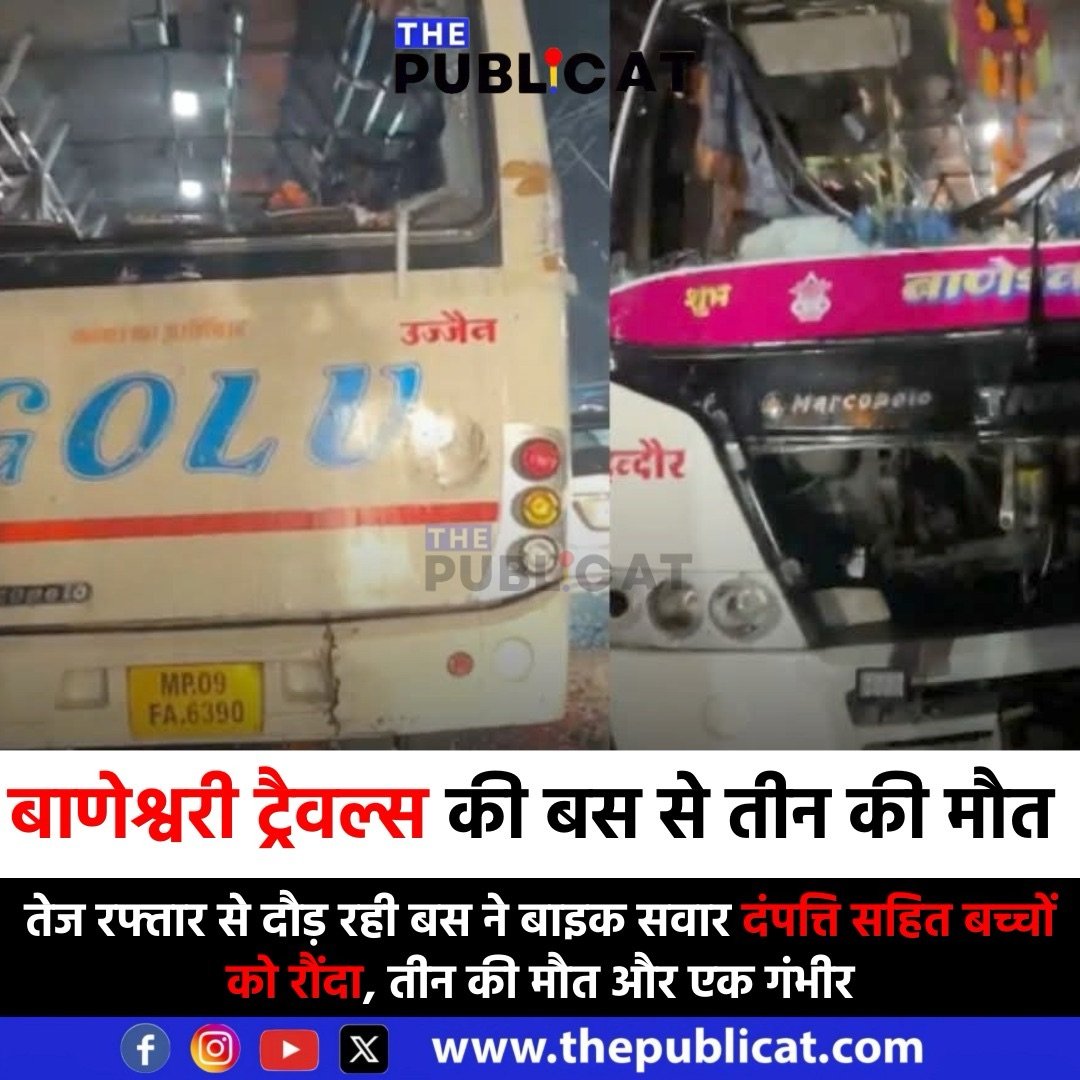 द पब्लिकेट, इंदौर। इंदौर–उज्जैन मार्ग पर सांवेर रोड पर तेज रफ्तार बस के कारण भीषण हादसा हो गया। बाणेश्वरी ट्रेवल्स की बस (एमपी 09 एफए 6390), जिसे स्थानीय लोग “सनातनी विधायक की बस” के नाम से पहचानते हैं, ने बाइक सवार परिवार को रौंद दिया। हादसे में दो पुरुष और एक महिला की मौके पर ही मौत हो गई, जबकि मासूम बच्चा गंभीर अवस्था में अरबिन्दो अस्पताल के आईसीयू में भर्ती है।