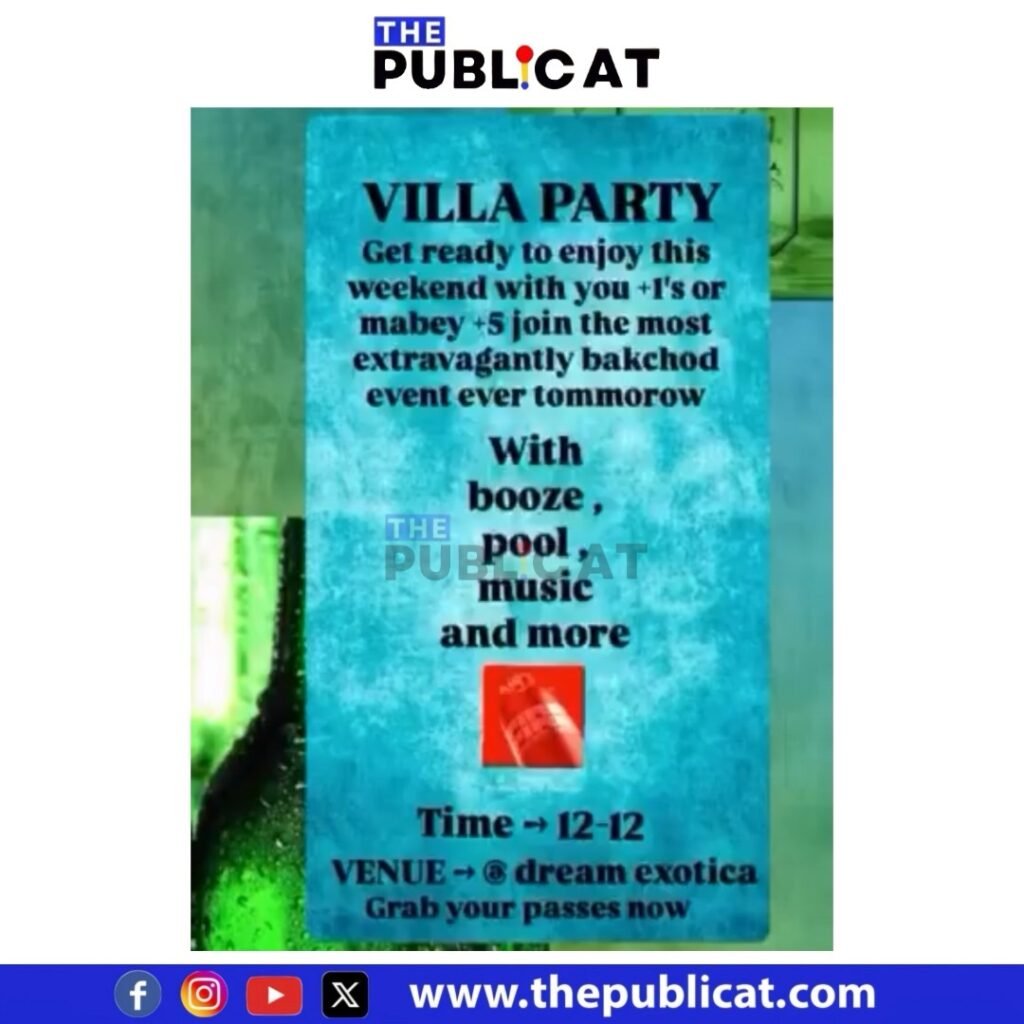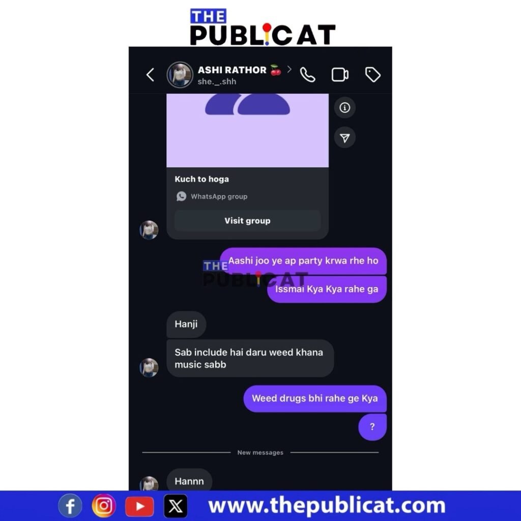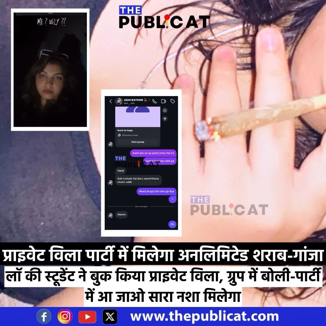 आपको बता दें, इंस्टाग्राम पर वीकेंड नाम का एक ग्रुप बना है। इसपर सैकड़ों युवक-युवतियां ऐड है। ग्रुप में लॉ की पढ़ाई करने वाली आशी राठौड़ नाम की युवती जो खुद को इवेंट ऑर्गनाइजर बताती है, ने एक पार्टी ऑर्गेनाइज की। पार्टी बड़ा पिपलिया गाओ स्थित ड्रीम एक्सोटिका विला में रखी है। द पब्लिकेट के पास ग्रुप की जानकारी आई है जिसकी वॉइस रिकॉर्डिंग में आशी राठौर नाम की युवती लोगों को बोल रही है कि शराब और गांजा भरपूर मिलेगा। पार्टी में तमाम ब्रांड की शराब मिलेगी। खुलेआम वह ग्रुप में गालियों वाली रिकॉर्डिंग भेज रही है। एक युवक में भी ग्रुप में वॉइस भेजी है जिसमें वह कह रहा है कि 1200 रुपए में अनलिमिटेड शराब है। पार्टी सुबह 12 से लेकर रात 12 तक है।