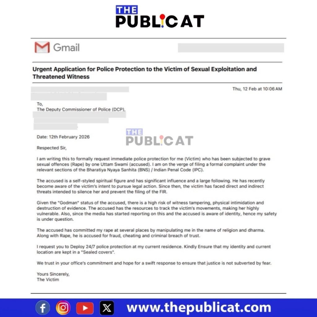मैं निवेदन करती हूं कि मेरे वर्तमान निवास पर 24×7 पुलिस सुरक्षा प्रदान की जाए। कृपया मेरी पहचान और वर्तमान स्थान को गोपनीय रखा जाए। हमें आपके कार्यालय की प्रतिबद्धता पर विश्वास है और आशा है कि भय के कारण न्याय बाधित नहीं होने दिया जाएगा।