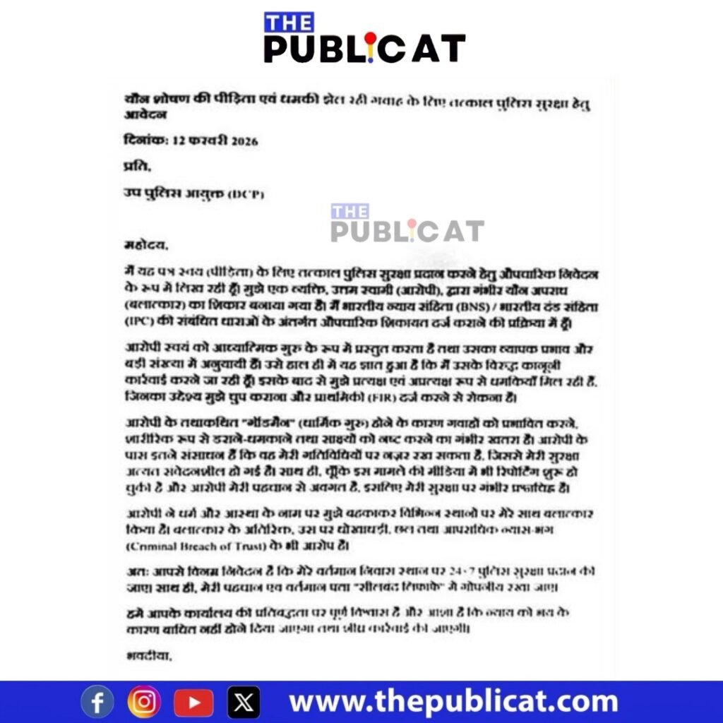 आरोपी स्वयंभू आध्यात्मिक व्यक्ति है, जिसका काफी प्रभाव और बड़ा अनुयायी वर्ग है। उसे हाल ही में मेरे द्वारा कानूनी कार्रवाई करने के इरादे की जानकारी मिल गई है। तब से मुझे एफआईआर दर्ज होने से रोकने और चुप कराने के लिए प्रत्यक्ष एवं अप्रत्यक्ष धमकियां दी जा रही हैं।