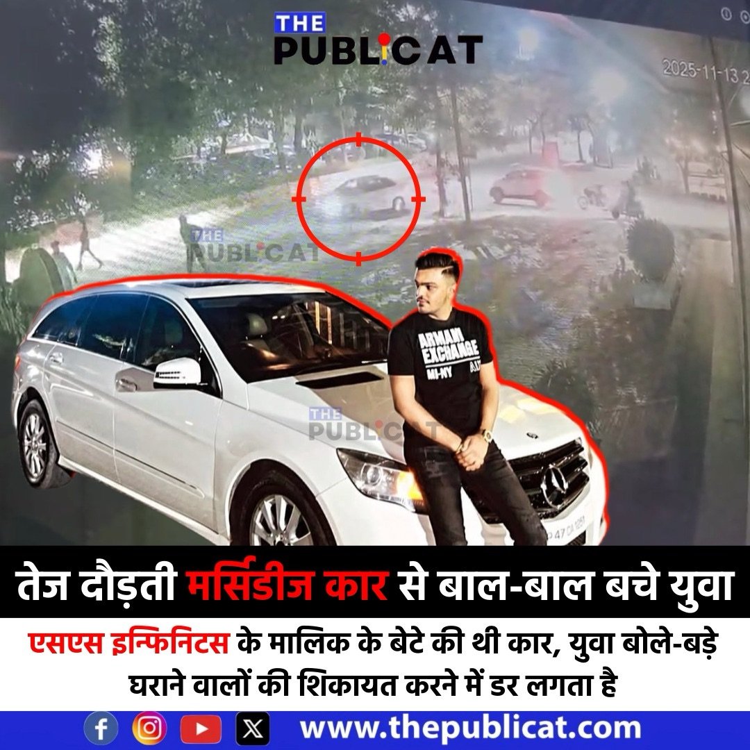 द पब्लिकेट, इंदौर। गुरुवार रात स्कीम नंबर 78 में उस समय दहशत फैल गई, जब SS इन्फिनिटस टाउनशिप के मालिक के बेटे की बताई जा रही सफेद मर्सिडीज ने ऐसी खतरनाक रफ्तार में कट मारा कि सड़क किनारे खड़े युवकों की जान जाते-जाते बची। महज कुछ सेकेंड की दूरी पर हुई यह घटना सीसीटीवी में कैद हो गई, जिसे युवकों ने खुद निकालकर देखा।